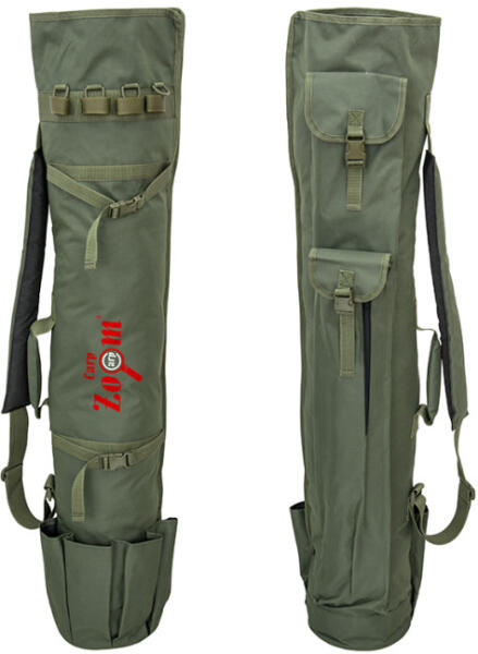 Carp Zoom Quiver Rod botzsák kerékpárral szállítva is kényelmes Méret: 120x26x20 cm A Carp Zoom Quiver Rod botzsák tökéletes, sokoldalúan felhasználható botzsák, mely tökéletes választás a motorral vagy kerékpárral horgászni járóknak. Közép része nagyméretű, nyitott zsákszerű, kialakítást kapott. Ennek egyik oldalán két zseb található. A nagyobb, 102x16x5 centiméteres csattal zárható, tökéletes a leszúrók, tripodok, de akár az összecsukható merítőháló tárolására is. Ez felett egy szintén csatos 73x12x4 centiméteres zseb található. Oldala részben cipzáras sliccelést kapott, így könnyen kivehetőek belőle a rövidebb kiegészítők, leszúrók is. A botzsák másik oldalán alul 4 darab zseb található, melyekbe beleültethető a botok nyele, majd felül az egyes tagok szintén négy darab erős tépőzárral fixálhatóak. A tökéletes rögzítést két darab csatos pánt garantálja. A Carp Zoom Quiver Rod botzsák hosszabb szállításnál is kényelmes, vállpántja széles, vastagon párnázott résszel készült, de akár kézben tartva is használható az erre a célra kialakított fogantyúval.