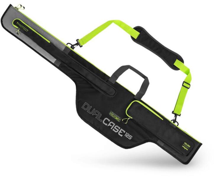 DELPHIN REAXE DualCASE botzsák 125cm A REAXE DualCASE egy kétrekeszes botzsák, amelyet feederbotok és egyéb felszerelések tárolására és szállítására terveztek. Belsejében rengeteg hely van, ami garantálja, hogy mindig lesz elegendő hely benne a különböző feederbotok számára. Nem kell attól tartania, hogy esetleg egy másik márkájú bot nem fér majd bele. Ez a botzsák fekete és szürke színben készül, merész zöld részletekkel. Tartós anyagból készül, amely ellenáll az enyhe esőzésnek, a harmatból származó nedvességnek és a durva bánásmódnak is. Az alján vízálló anyag található, így a tok akár nedves talajra is helyezhető anélkül, hogy megsérülne. A tok minden oldala és az elválasztó is alaposan bélelt. Így akár két bot egyidejű szállításakor sem sérülnek meg a benne szállított felszerelések. Az orsókat tároló rész minden szabványméretű feeder készség számára elegendő helyet biztosít. A botzsák egy T-PROTECT nevű külső zsebbel is rendelkezik, amit a feeder spiccek szállítására szolgáló tok számára terveztek. A zseb gumírozott szövetből készült a spicctagok védelmének fokozása érdekében. Egy másik oldalsó zseb a HOLDER POCKET nevet viseli. Ez cipzárral rendelkezik, és a REAXE feeder tartókhoz vagy más aprócikkek tárolására tervezték. A másik oldalon egy műanyag kapcsos és cipzáras zseb található az összecsukható merítőháló vagy merítőhálónyél tárolására. Van még két további félzseb rajta a leszúrók számára, melyek állítható pánttal rögzíthetők. A könnyebb szállítás érdekében a tok nagy, kiváló minőségű levehető vállpánttal és két textil fogantyúval van felszerelve. A nagy cipzárak minőségi csúszkákkal és húzókákkal biztosítják, hogy a botzsák minden része megfelelően zárható legyen. Technikai információ: